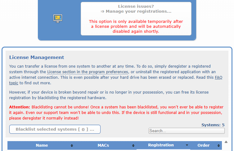 Aquí puede ver todos los sistemas registrados actualmente y compararlos con su propia gestión de software. Sin embargo, no es posible realizar un desregistro normal desde allí, ya que el desregistro solo puede hacerse directamente en los sistemas para garantizar que el software realmente se ha eliminado. No obstante, tiene la posibilidad de bloquear de forma permanente e irrevocable sistemas con hardware que ya no existe físicamente mediante una lista negra, liberando así su registro de nuevo.